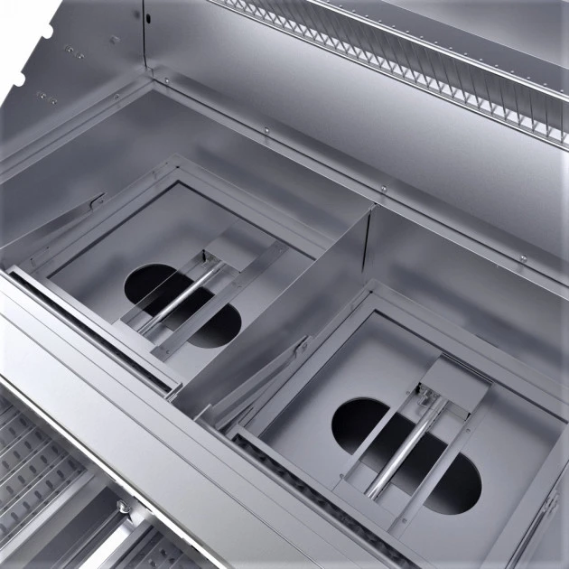 Comme ses cousins à gaz de chez Sunstone, le modèle EMCHDZ42 bénéficie du nouveau système d’allumage combiné à deux brûleurs puissants intégrés sous chaque tiroir à charbon de bois.