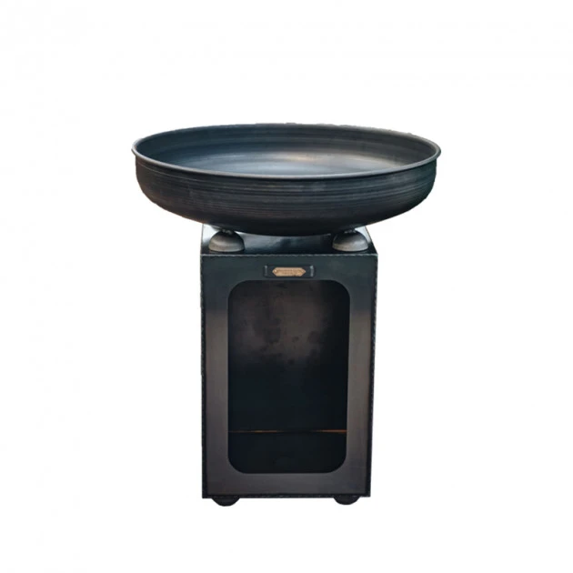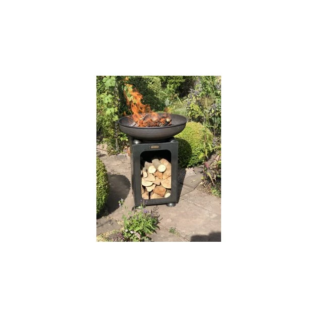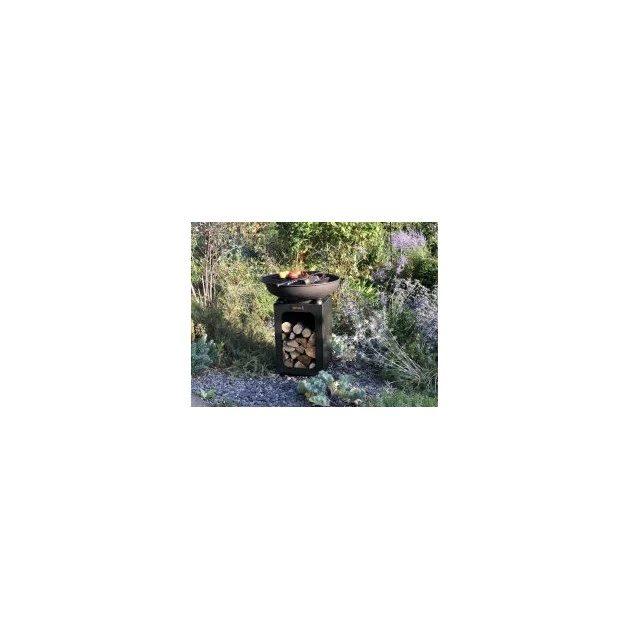 Ce braséro posé sur ce rangement à bois est un foyer à feu ouvert. Il se placera parfaitement dans votre jardin et offrira un design élégant et sophistiqué à votre extérieur.