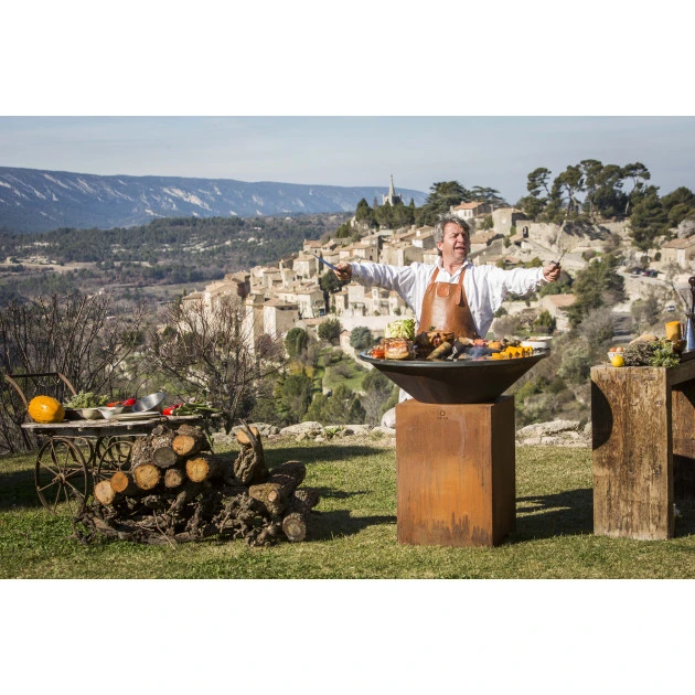 OFYR révolutionne la façon de cuisiner en extérieur. Grâce à sa forme, vos convives se rassemblent autour du feu et du chef.
