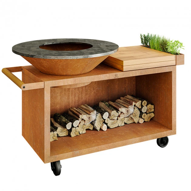 Présentation du braséro plancha OFYR Island 100 pro corten avec plan de travail en teck :