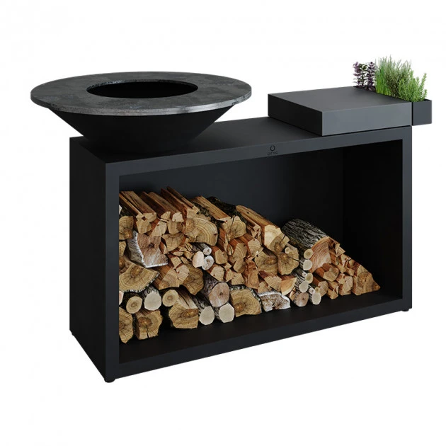 Présentation du braséro plancha OFYR Island 85 noir avec plan de travail en céramique anthracite :