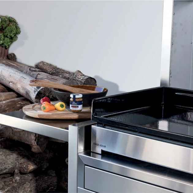 Moderne, solide et tout terrain, ce chariot en inox est adapté afin de recevoir une plancha Premium 60 de la marque forge Adour.