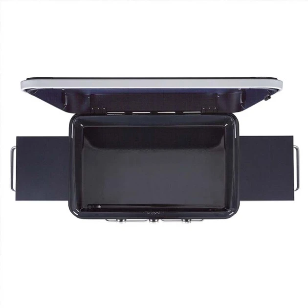 Il possède 2 tablettes latérales qui vous permettront d’avoir un espace de travail à proximité pour un confort optimal. Il est en inox de qualité marine et acier galvanisé noir. Le chariot possède également une porte avec poignée chromée.