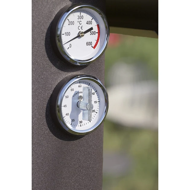 - Réglable : Ce barbecue et four à bois est totalement réglable. Il est doté d’une valve de régulation des fumes et il est possible d’évaluer la température intérieur grâce au minuteur.