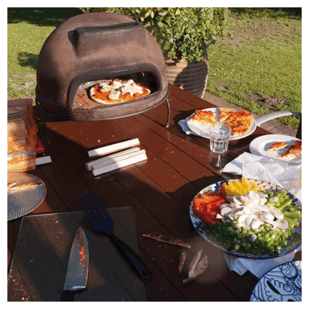La terre cuite offre un excellent rayonnement de chaleur et la préserve à la perfection. Couplé avec un feu de bois, ce four à pizza atteint d’excellentes températures de cuisson ce qui vous permet de cuire vos pizzas en 2/3 minutes. Plus besoin de traîne en cuisine, composez vos pizzas dehors avec vos invités, mettez la à cuire et dégustez la directement.