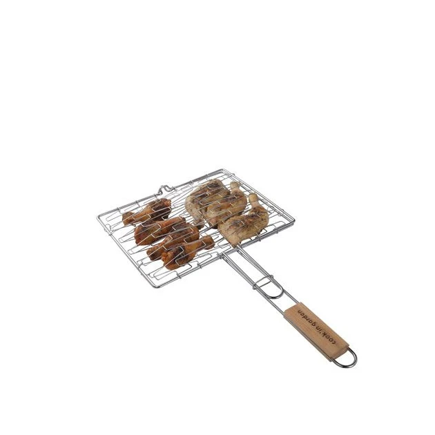 Cette petite grille rectangulaire accueille 6 à 7 cuisses de poulet à rôtir. Ses mailles emprisonnent les petites pièces de viande, afin par exemple que les petits filets et la peau croustillante du poulet ne se détachent pas et tombent accidentellement dans les braises.