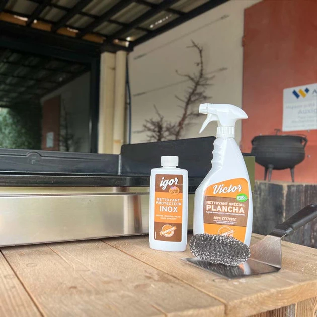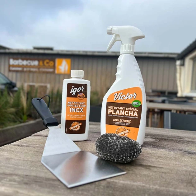 - Un nettoyant plancha surpuissant : Ce nettoyant Victor est spécialement conçu pour s’attaquer aux graisses cuites et recuites, sur tous les types de plaques (fonte, acier, inox). Il agit également sur les projections de graisses sur le châssis de la plancha et sur le bac récupérateur de graisses.