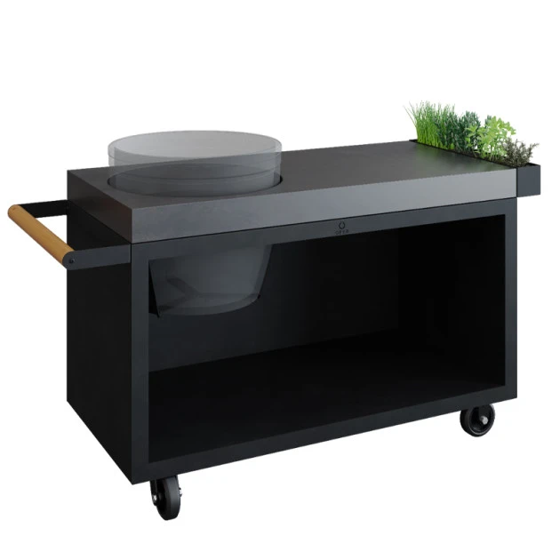 Grâce aux roues, vous pourrez déplacer facilement sur différentes surfaces votre unité de cuisson. Cette table OFYR PRO convient au kamado The bastard Urban L et offre de l’espace additionnel avec son plan de travail en béton. L’espace de rangement des bûches pourra également être utilisé pour y placer des accessoires.